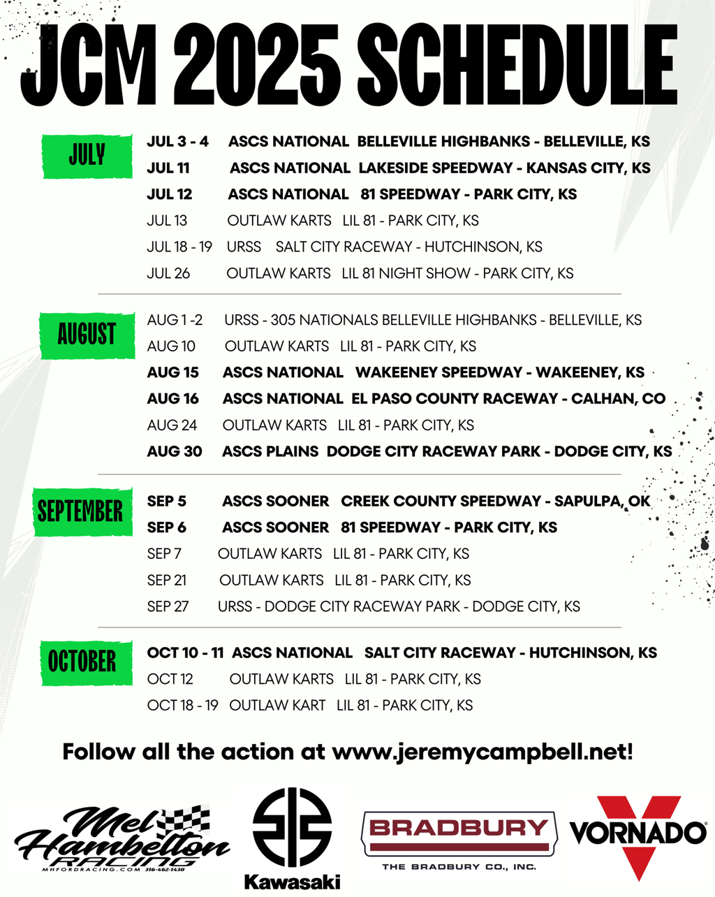 Events in Bold are for the #10c Sprint Car - this schedule also includes schedule dates for #51 Ojar Peters Car, driven by Jeremy Campbell, and the #17c cage kart, driven by Jaxten Campbell.